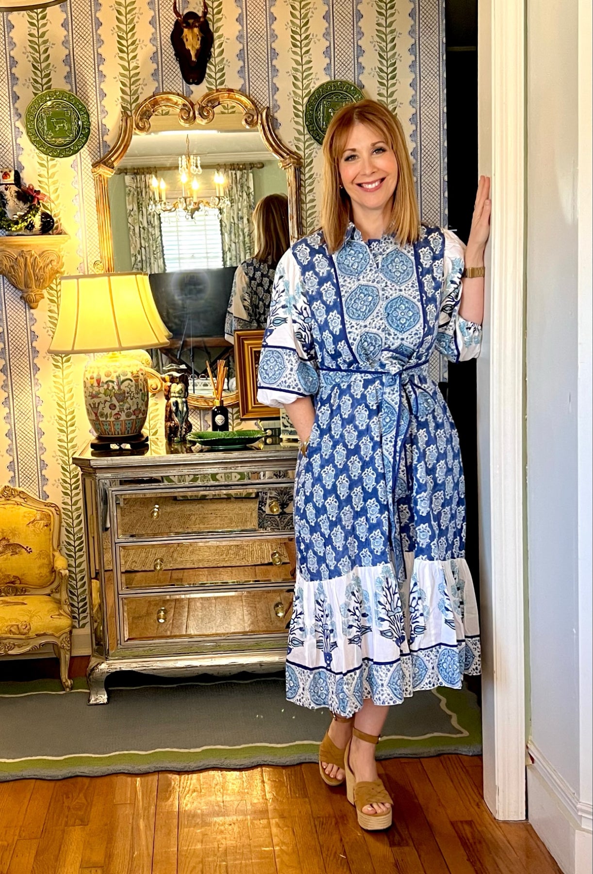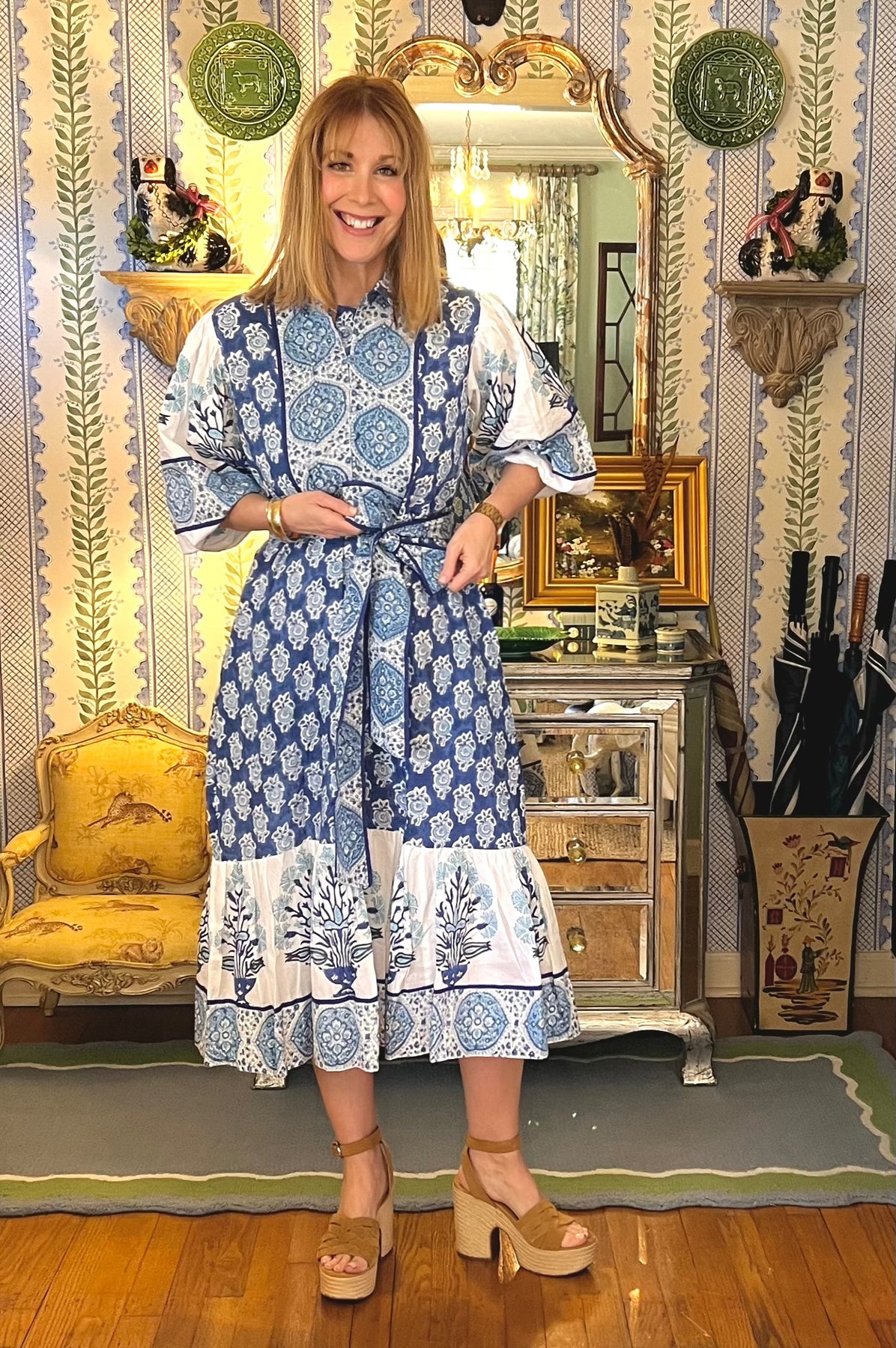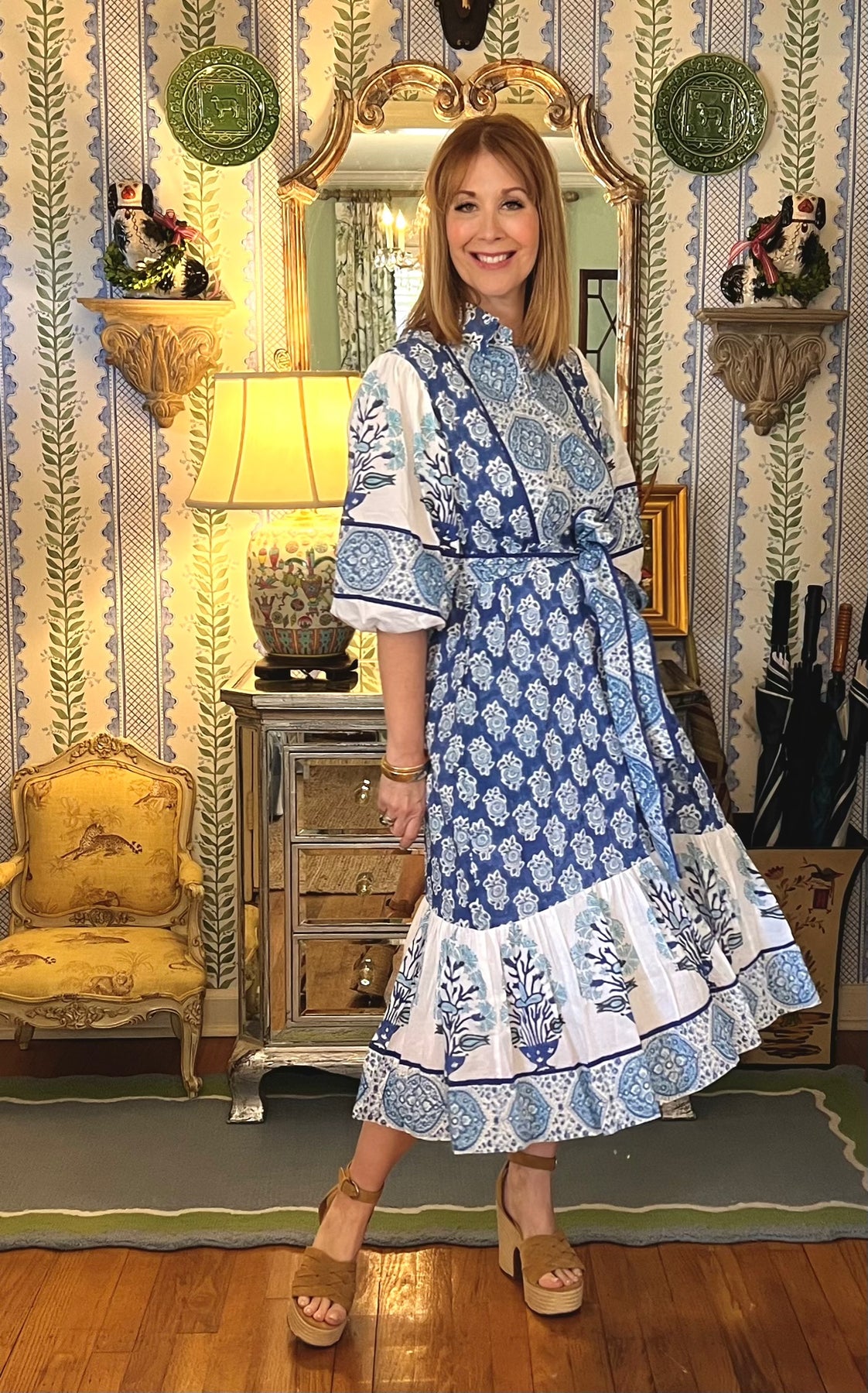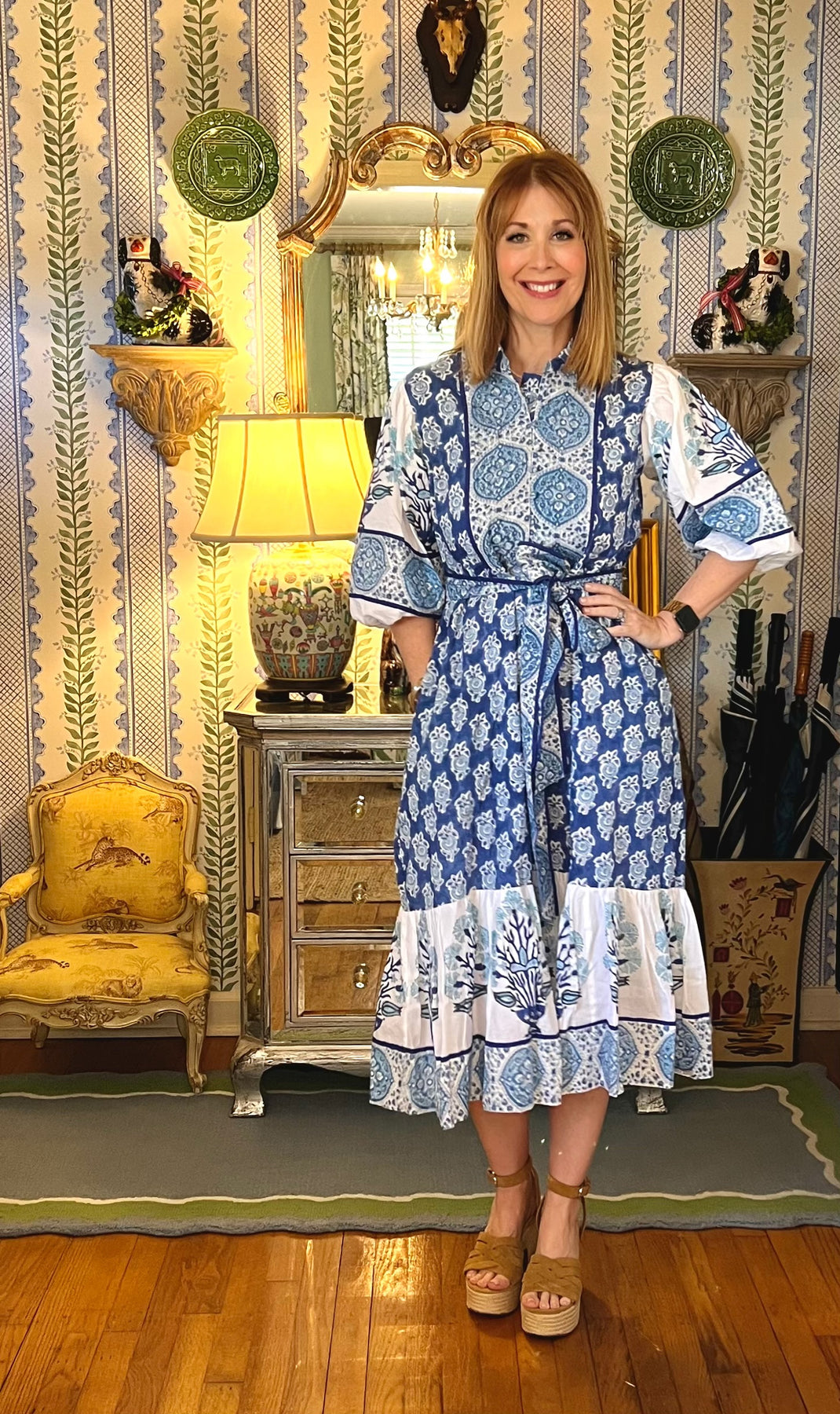 Charleston Blockprint Midi Dress in Blue Medallion