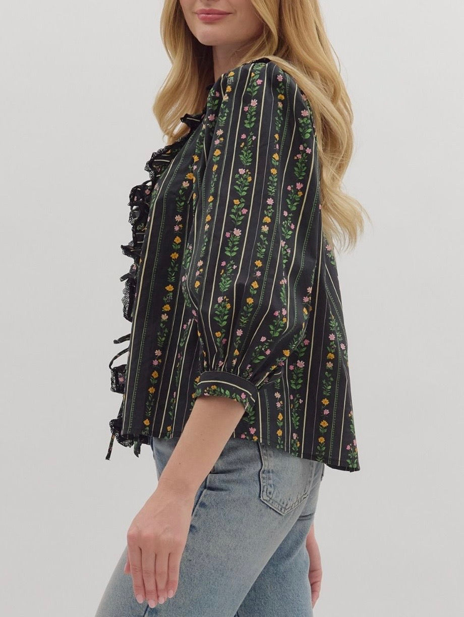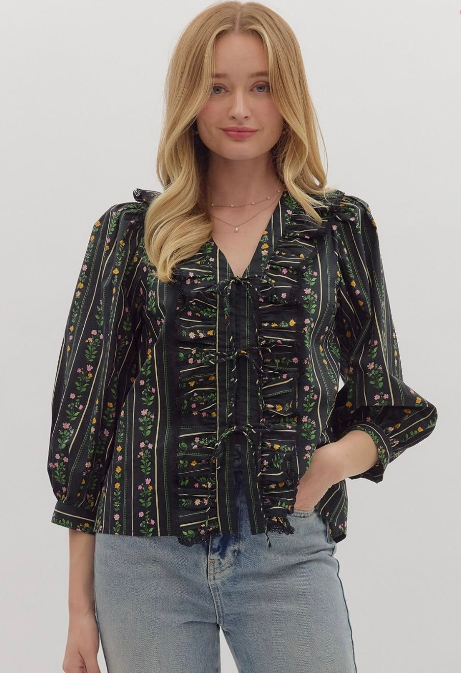 Introducing the Tilley Floral Print Ruffle Top in Black! This statement sleeve top features a classic neutral colorway and an elasticized cuff for a dramatic look when pulled up. Perfect for casual wear with jeans or dressing up for a dinner out. Elevate your wardrobe with this beautiful and showstopping top.